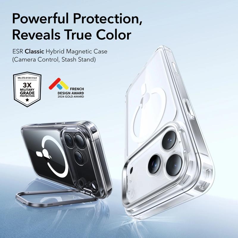 ESR Classic Hybrid Kickstand Case för iPhone 17 Pro kombinerar slimmad elegans med kraftfullt skydd. Dess transparenta hårda baksida visar upp din iPhone 17 Pro's originaldesign medan förstärkta TPU-hörn ger extra hållbarhet mot fall och stötar.