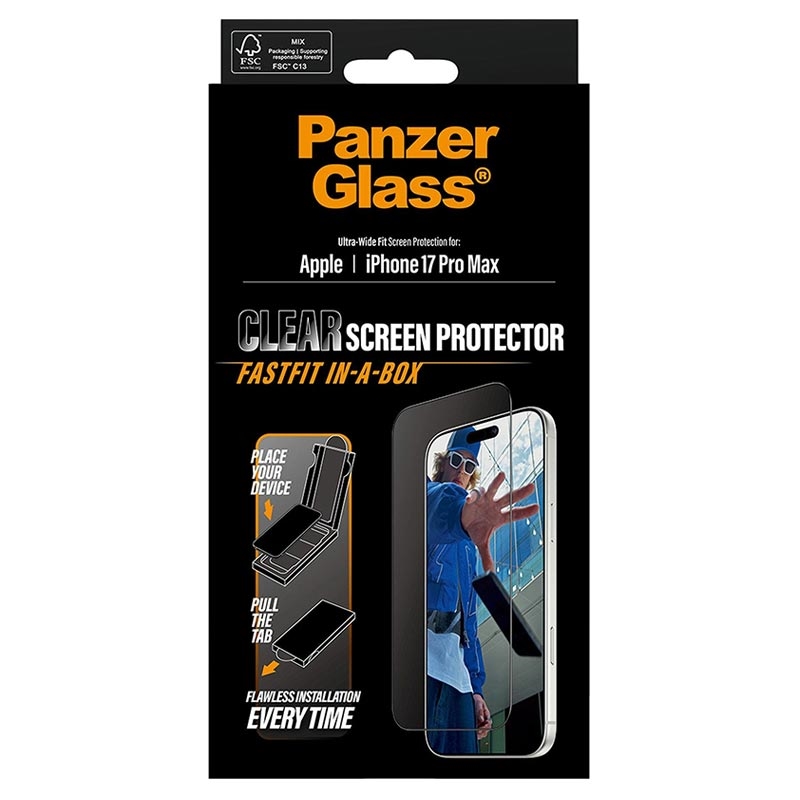PanzerGlass Ultrabred passform m. FastFit In-A-Box skärmskydd i härdat glas för iPhone 17 Pro Max