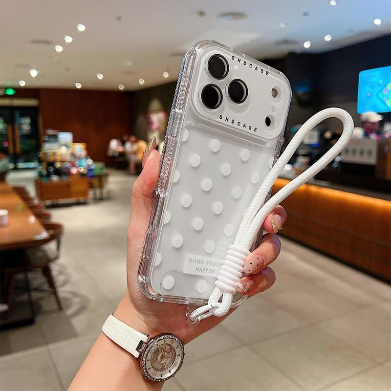 - Specifikationer - Material: TPU + PC | Kompatibilitet: iPhone 17 Pro | Stil: Transparent med prickar | Tillbehör: Fodral + linsfilm + rem.