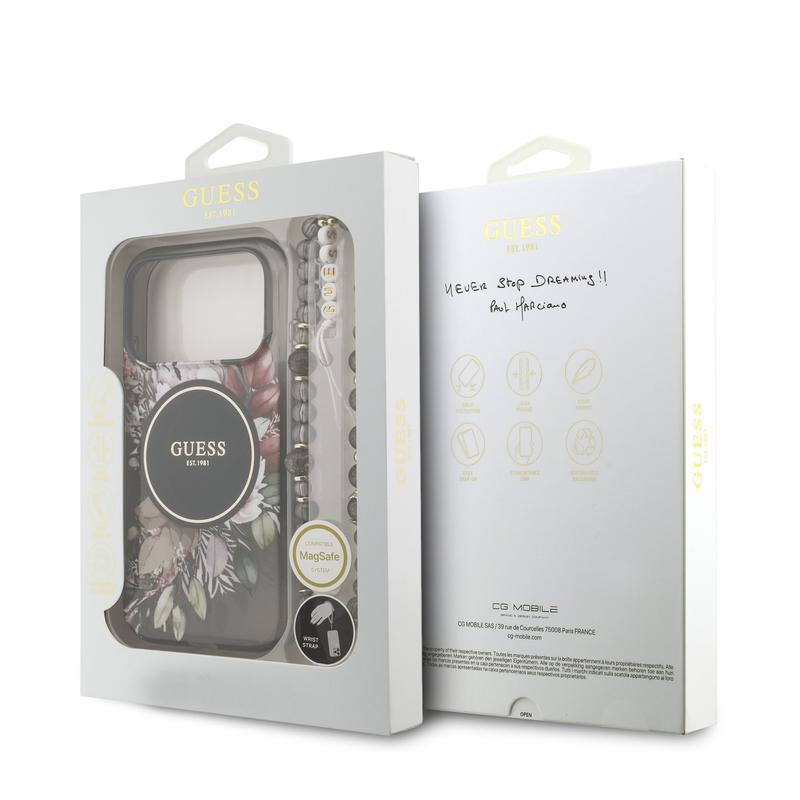 Guess IML Flowers-skal med pärlband för iPhone 17 Pro - MagSafe-kompatibelt elegant skyddsfodral med pärlband för handleden