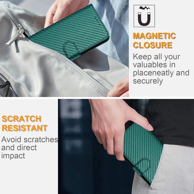 Detta plånboksfodral erbjuder elegant design, tillförlitligt skydd och smart användbarhet. Den texturerade kolfiberfinishen ger ett modernt, professionellt utseende, medan det inre TPU-skiktet absorberar stötar från oavsiktliga fall. Med handsfree-funktionalitet och en avtagbar rem är det byggt för komfort och mångsidighet.