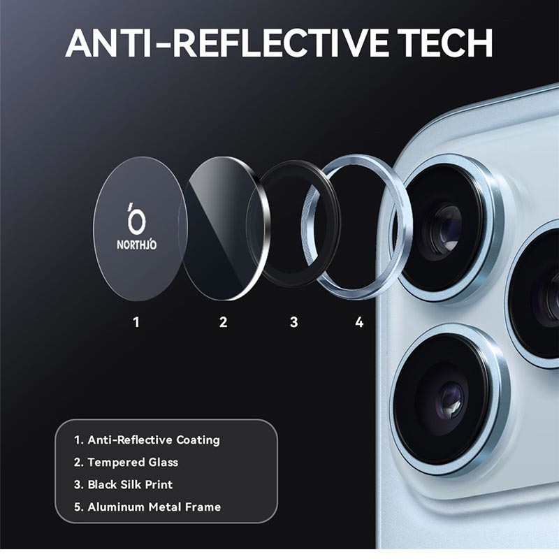 Uppgradera din iPhone 17 Pro, iPhone 17 Pro Max med Northjo kameralinsskydd. Med en aluminiumring med CD-ådror ger det en elegant, modern touch till din iPhone 17 Pro, iPhone 17 Pro Max samtidigt som det erbjuder ett robust skydd. Det 9H härdade glaset skyddar mot repor, stötar och damm och ser till att kameralinsen förblir kristallklar. Med enkel, verktygsfri installation kan du förbättra hållbarheten och estetiken hos din iPhone 17 Pro, iPhone 17 Pro Max på några sekunder.