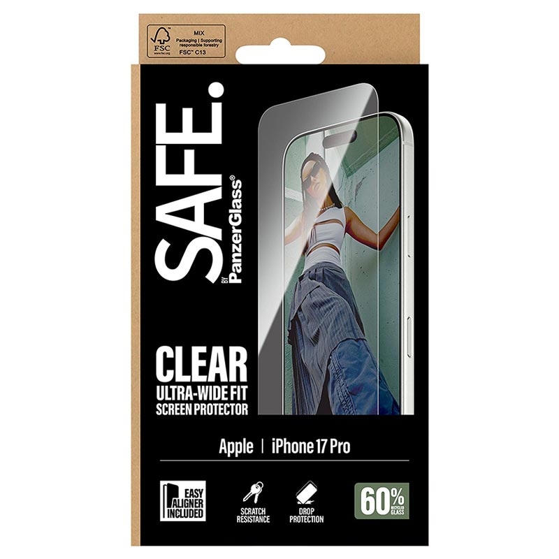 SAFE. by PanzerGlass skärmskydd för iPhone 17 Pro erbjuder överlägset skydd med 60% återvunnet glas, vilket skyddar din enhet från droppar, repor och stötar. Dess ultrabreda passform garanterar full täckning och tydlig skärmvisning, medan den fingeravtrycksresistenta beläggningen håller skärmen ren. Med 100% touchkänslighet och enkel installation med den medföljande EasyAligner, blandar detta skärmskydd hållbarhet och funktionalitet sömlöst.