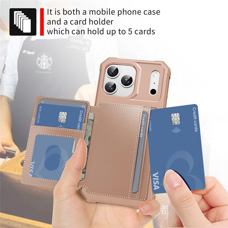 - Detta plånboksfodral för iPhone 17 Pro har en säker knappstängning, plånboksdesign och flera kortfickor, samt plats för kontanter