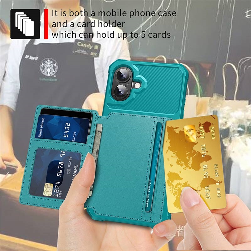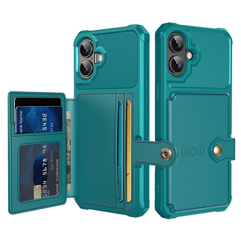 - Detta plånboksfodral för iPhone 17 har en säker knappstängning, plånboksdesign och flera kortfickor, samt plats för kontanter