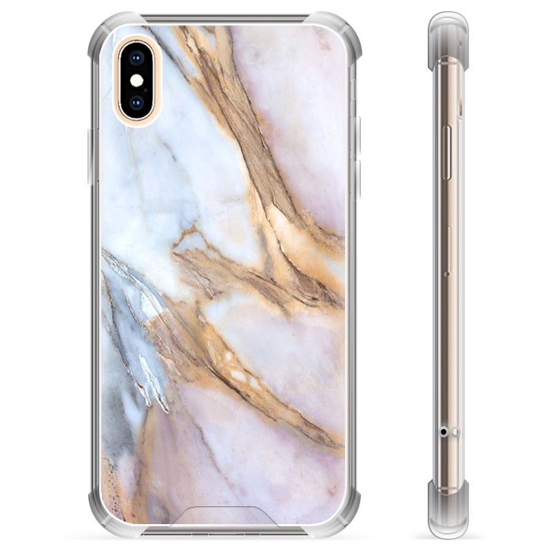Det här är ett hybridskal för iPhone X och iPhone XS, med en elegant marmordesign som kombinerar både stil och skydd. Skalet består av en hård bakplatta med högupplöst marmorprint och en flexibel, genomskinlig kant som ger en buffereffekt vid stötar eller fall. Mönstret ger intryck av äkta marmor och har naturliga variationer i färg och ådring, vilket gör varje skal unikt. Materialet är tåligt mot repor och smuts, vilket håller din telefon ser ny ut under längre tid. Passformen är exakt med utskärningar för alla portar och kamera, samt täcker knapparna utan att begränsa användbarheten. Detta skal är en ideal kombination av mode och funktion för din iPhone X eller XS.
