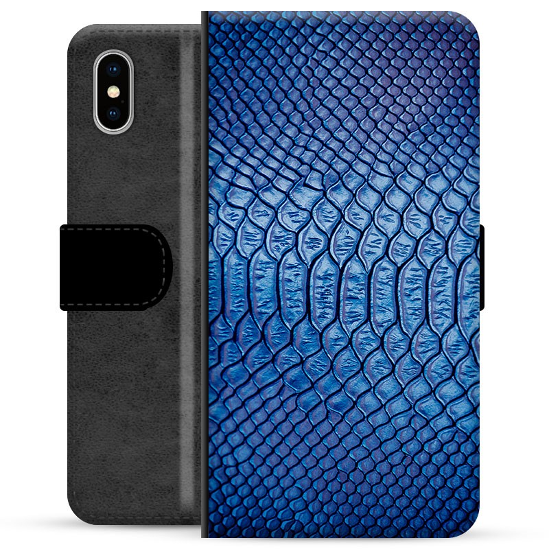 Detta premium plånboksfodral för iPhone X / iPhone XS är utformat för att erbjuda stil och funktion. Fodralet är tillverkat av högkvalitativt läder och har ett iögonfallande mönster som efterliknar skinn av en fjällig orm, färgat i en djup blå nyans som ö