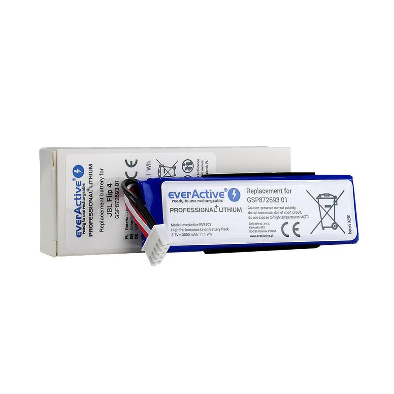 EverActive EVB102 Lithium+ Professional Series ersättningsbatteri är en högkvalitativ originalprodukt som är utformad som en direkt ersättning för det batteri som används i den populära JBL Flip 4-högtalaren. Med en nominell kapacitet på 3000mAh vid 3,7 V och en ackumulerad energi på 11,10 WH garanterar detta batteri oavbruten, timslång underhållning för dig och dina vänner. Paketet består av 3,7 V li-ion-celler som är seriekopplade, och den styrelektronik som används gör att EverActive EVB102 fungerar exakt på samma sätt som batterier som är installerade i fabriksenheter. De tåliga cellerna klarar mer än 500 laddningscykler, vilket ger långvarig prestanda. Detta batteri är även CE-märkt (inklusive ROHS) och levereras med produktkoden EVB102. Det ersätter batterierna GSP872693 01 och GSP87269301.
