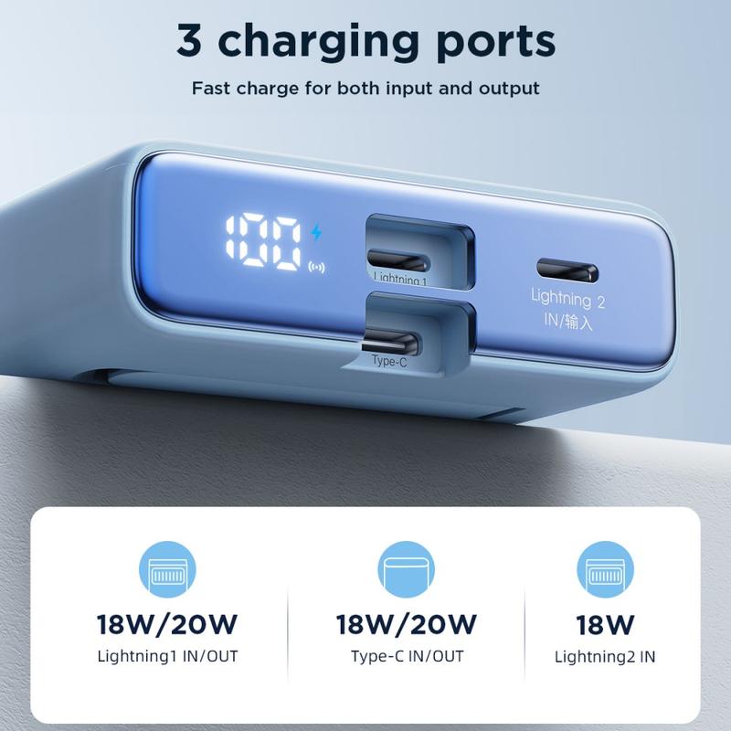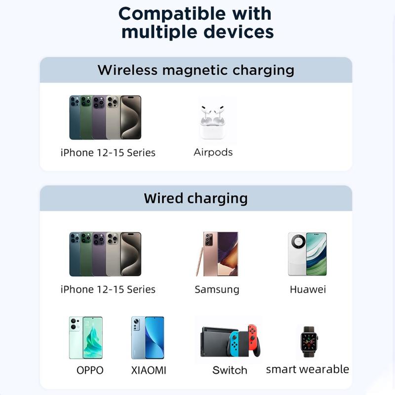 Levereras med en löstagbar kabel, kan ladda tre enheter med en kabel, inklusive för Apple/Android-enheter/självladdning