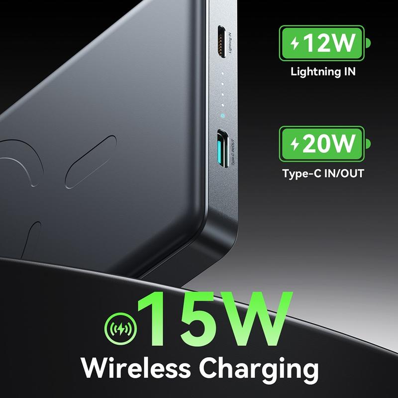 - Dubbla ingångsportar: USB-C och Lightning för flexibel laddning