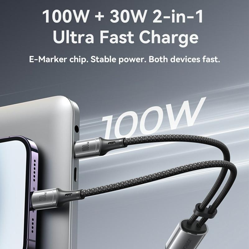 Ladda och synkronisera fler enheter med en smart kabel. Laddningskabeln JOYROOM S-A57 med dubbla anslutningar kombinerar USB-C till USB-C med en extra Lightning-kontakt, vilket ger dig flexibel kompatibilitet för olika enheter utan att behöva bära med dig flera kablar. Den stöder upp till 100 W snabbladdning på kompatibla USB-C-enheter och erbjuder upp till 480 Mbps dataöverföring för synkronisering i vardagen. Den 1.5m långa kabeln är byggd med en slitstark nylonflätad mantel och ABS-kontakthölje och är perfekt för skrivbord, soffor och resor - så att du får en bekväm räckvidd utan trassel.