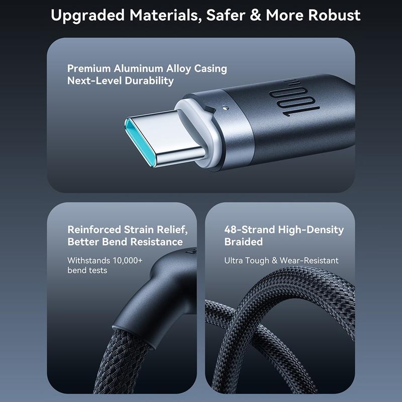 Kabeln är tillverkad med ett hölje av aluminiumlegering och ett slitstarkt yttre av flätad nylon, och är konstruerad för regelbunden daglig användning. Den erbjuder både snabbladdning och dataöverföring i en pålitlig lösning, med en robust konstruktion som är utformad för att tåla böjning, drag och dagligt slitage.