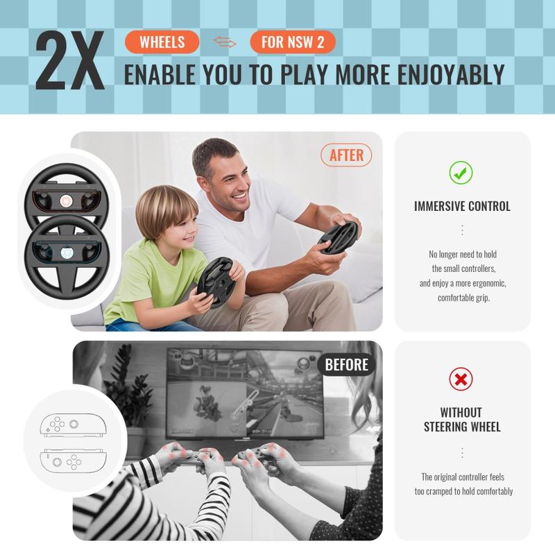 JYS-NS2261-paketet ger omedelbar racingkänsla utan dyr kringutrustning. Två hjul innebär att du och en vän kan hoppa direkt in i tävlingsspel, medan den fjäderlätta, resevänliga designen gör att du kan tävla var som helst. Slitstark ABS håller din Joy-Con säker, och det verktygsfria inskjutningsfästet innebär noll installationsproblem - bara klicka, tävla, upprepa.