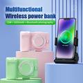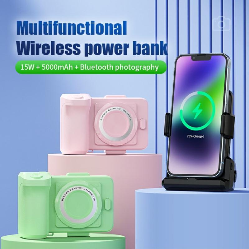 YR-1 3-i-1 Wireless Power Bank är en mångsidig enhet som kombinerar trådlös laddning, en telefonhållare och en Bluetooth-kameraslutare. Den har ett 5000mAh-batteri, 15W trådlös snabbladdning och en mekaniskt låsbar mobilklämma för stabil fotografering. Den är kompatibel med olika enheter och inkluderar magnetiska Type-C- och Micro USB-adaptrar för telefoner utan trådlös laddningsfunktion.