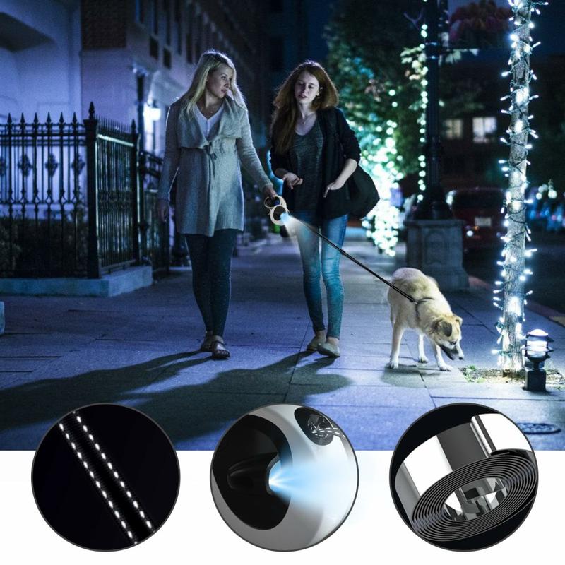 LED-upprullningsbart hundkoppel 5m - USB-laddningsbart ljus, 360° trasselfritt, reflekterande tejp, inbyggd hållare för avfallspåse för hundar upp till 50kg