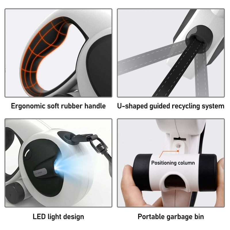 Du får bekvämligheten med ett infällbart koppel, säkerheten med en inbyggd ficklampa och reflexband och det praktiska med en hållare för avfallspåsar - allt i en robust och snygg enhet. Färre tillbehör att jonglera med innebär lugnare och trevligare promenader för både dig och din hund.