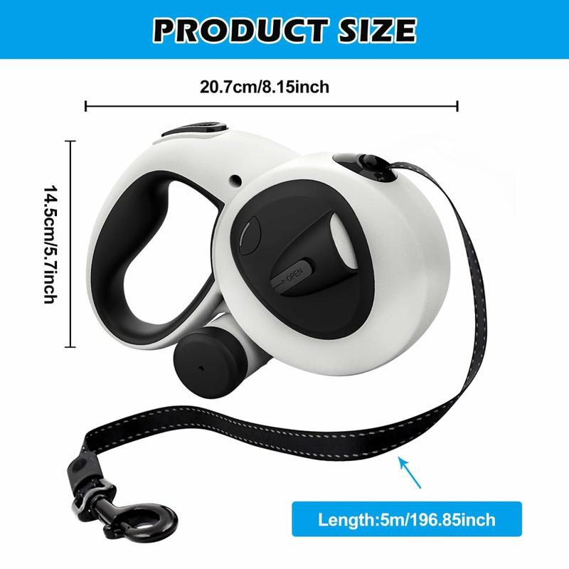 Ge varje promenad mer frihet, säkerhet och stil. Detta 5meter långa upprullningsbara koppel har en ljusstark USB-laddningsbar LED-ficklampa, reflexband med hög synlighet och ett silkeslent bromssystem med en knapp som kontrollerar även de största raserna (upp till 50kg). Ett ergonomiskt, halkfritt handtag håller dig bekväm under långa promenader, medan den integrerade avfallspåsedispensern gör att du alltid är förberedd.