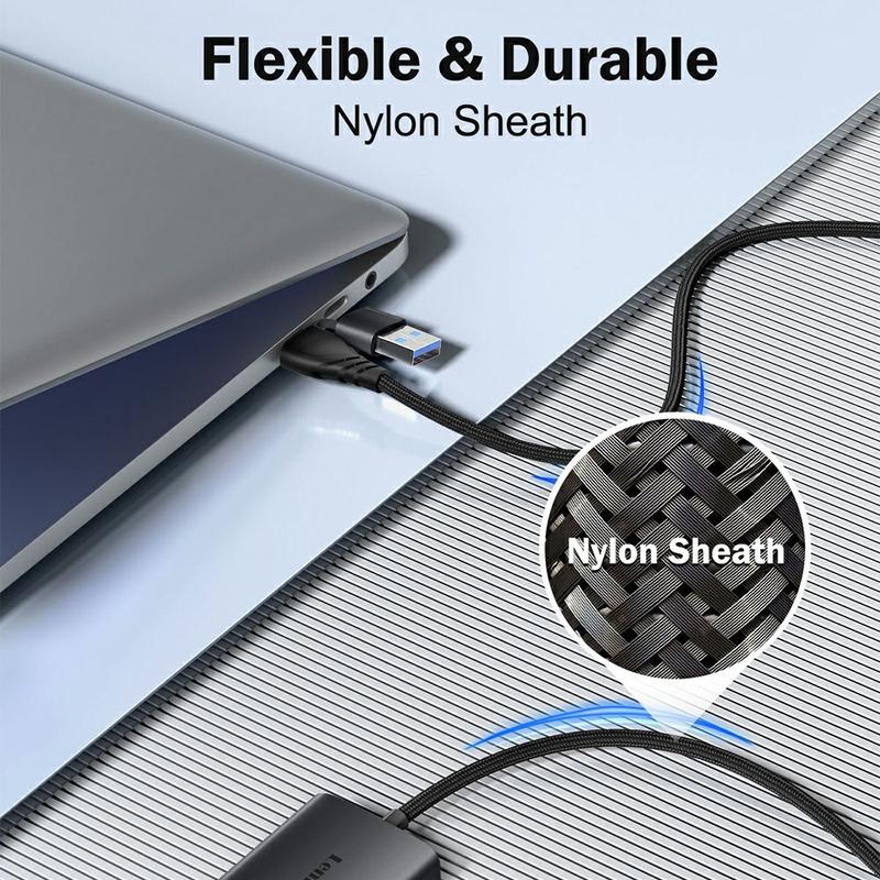Adaptern har en nylonflätad kabel som är motståndskraftig mot trassel och drag, vilket förbättrar hållbarheten över tid. Den kompakta adapterkroppen och den 60 cm långa kabeln gör den lätt att bära med sig i en datorväska eller ryggsäck.