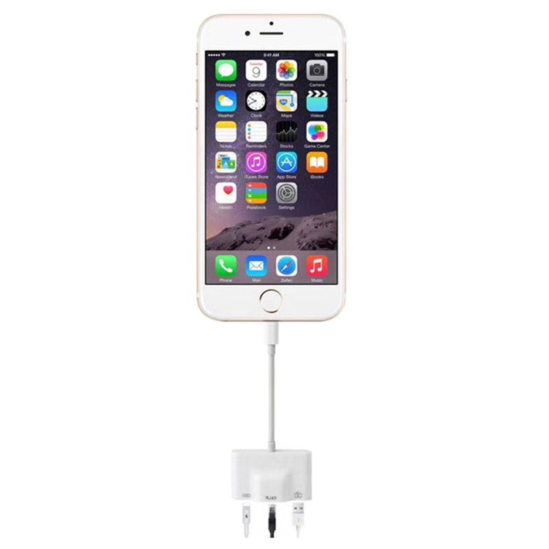 Denna multifunktionella 3-i-1 lightning kabeladapter har en RJ45 Ethernet LAN nätverksport, en USB 2.0 port och en 8-polig lightningport med pass-through laddning. Adaptern stödjer 19/100 Mbps internetanslutning och är kompatibel med alla 8-poliga Apple iPhones och iPads som drivs på iOS 10 eller nyare.