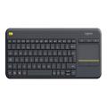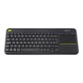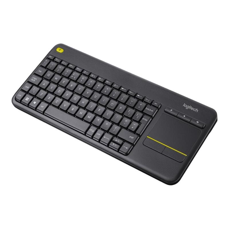 Wireless Touch Keyboard K400 Plus är en tangentbordslayout i full storlek och pekplatta i kompakt storlek. Incurve-tangenter är idealiska för maskinskrivare och det mjuka tangenttrycket gör detta till ett tyst tangentbord. Pekplattan i full storlek ger dig de välbekanta rullnings- och navigeringsgester. Med vänster- och högerklicksknapparna under pekplattan och volymkontrollknapparna ovanför är kontrollen nära till hands. För tvåhandskontroll, som vanligtvis används av de som gillar att använda tummarna för att navigera, finns en vänster musklicksknapp på tangentbordets övre vänstra sida – navigera med höger hand, välj med vänster.