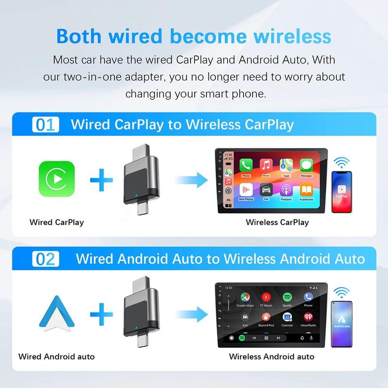Anslut helt enkelt adaptern till bilens USB- eller Type-C-port - ingen demontering eller tekniska färdigheter krävs. Den ger en stabil och snabb anslutning och bevarar bilens ursprungliga infotainmentprestanda.
