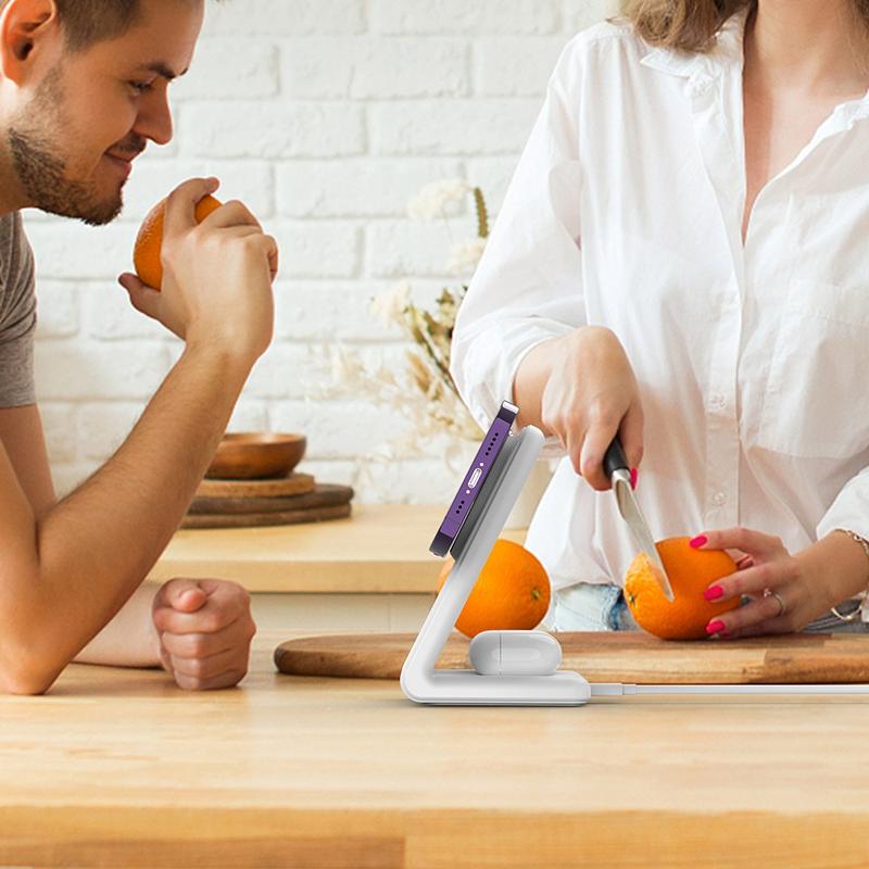 Använd din telefon handsfree medan den laddas - perfekt för videosamtal, titta på innehåll eller läsa meddelanden. Den ergonomiska vertikala designen håller skärmen synlig och arbetsytan städad.