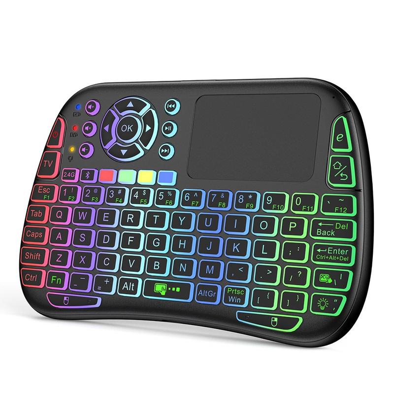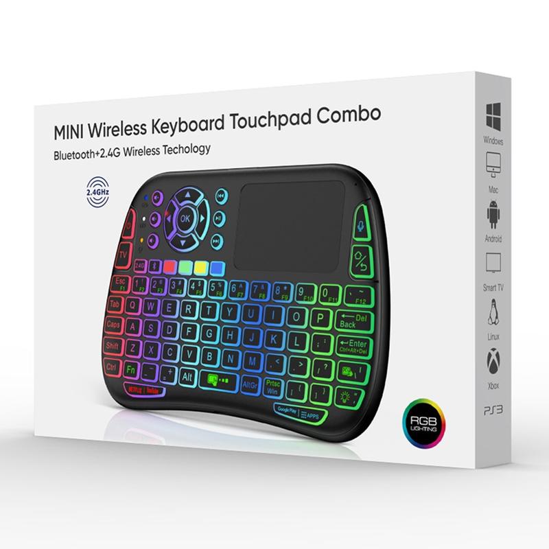 Tangentbordet stöder både 2,4 GHz trådlös anslutning via USB-mottagare och Bluetooth-kompatibel 5.0, vilket ger dig flexibilitet på många enheter, inklusive Smart TV, HTPC-system, bärbara datorer, surfplattor och Android-enheter. Den inbyggda pekplattan med multitouch-gester ersätter en mus, medan den färgglada RGB-bakgrundsbelysningen gör den enkel att använda även i mörka rum.