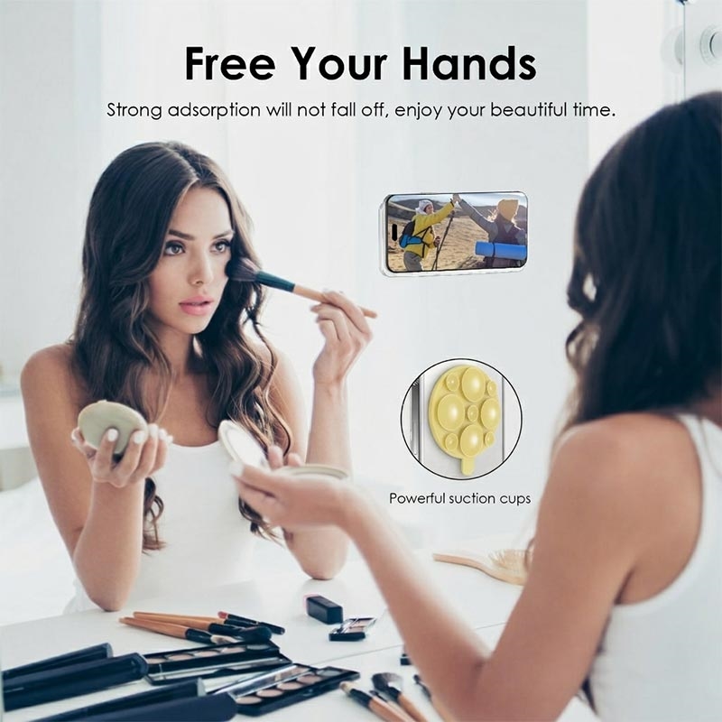 Håll din telefon säkert på plats och inom synhåll med denna handsfree-hållare med magnet och sugkopp. Denna kompakta hållare är utformad för att underlätta vardagen och kombinerar en stark magnet med en sugkopp av silikon, vilket gör det enkelt att fästa telefonen på släta ytor som speglar, kakel, glas och väggar.