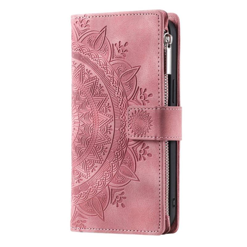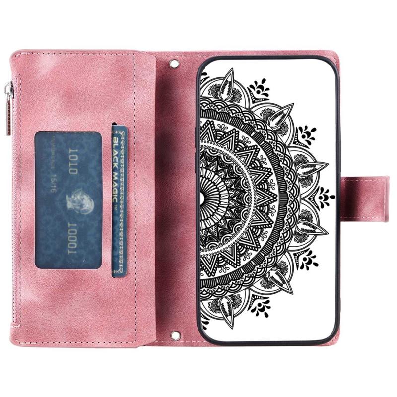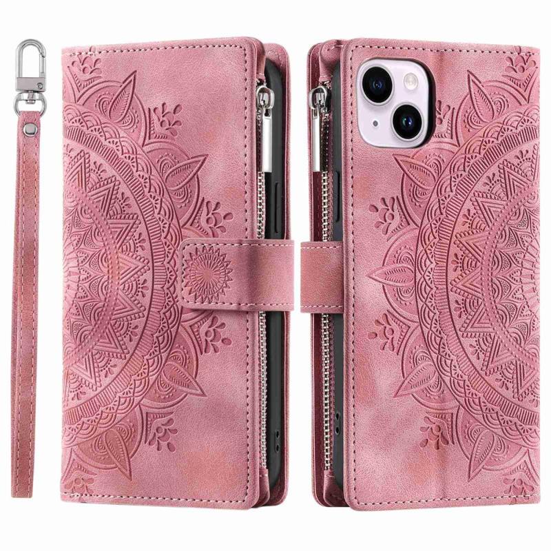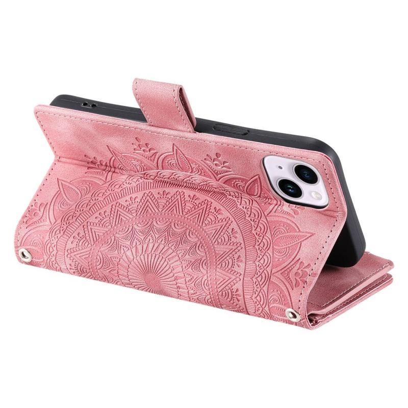 Telefonskal för iPhone 14 Plus, repfri Mandala Flower Imprinted PU-läderfodral Stativ med flera kortplatser Blixtlåsficka Plånboksfodral
