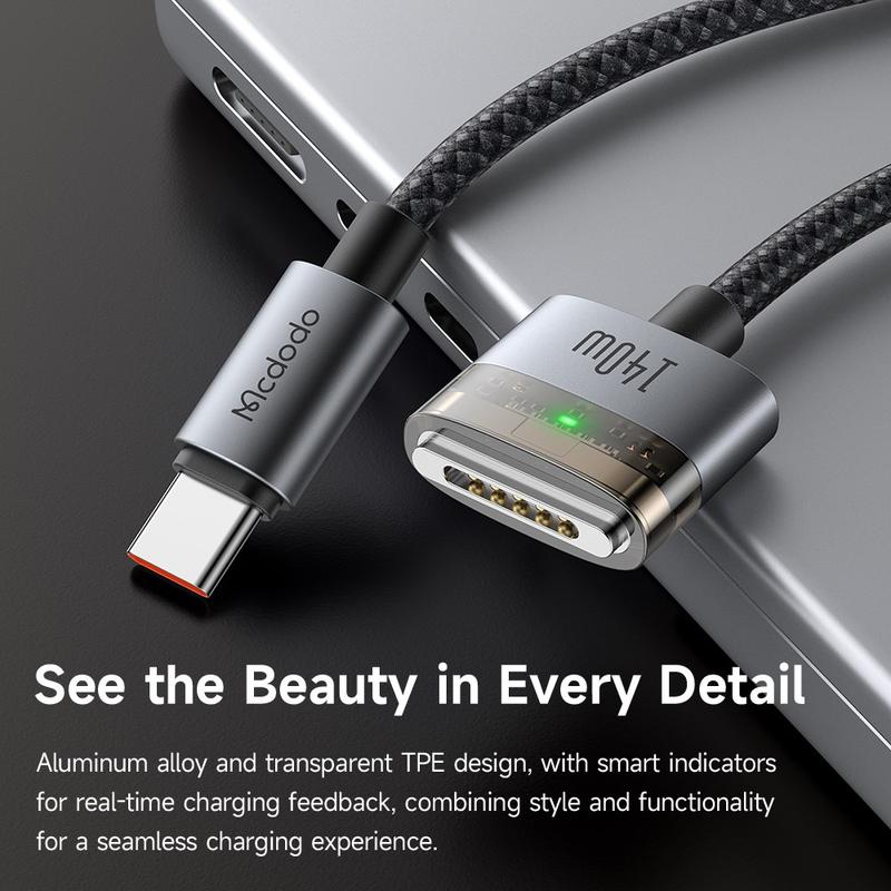 Ladda dina enheter snabbare och smartare med MCDODO CA-207. Med 140W strömförsörjningsstöd är den här kabeln utformad för att ge en stadig, effektiv laddning till dina Apple-enheter, inklusive MacBooks och iPhones, med den extra bekvämligheten med magnetisk inriktning för en omedelbar anslutning.