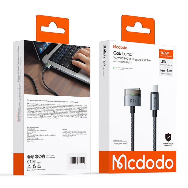 Mcdodo CA-207 140W USB-C till MagSafe 3 laddningskabel - 2m - Nylonflätad med indikatorlampa