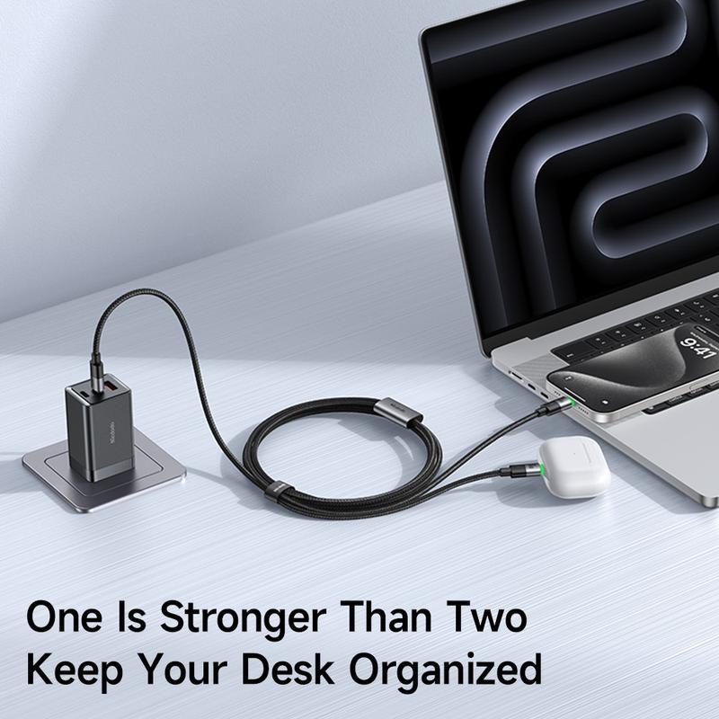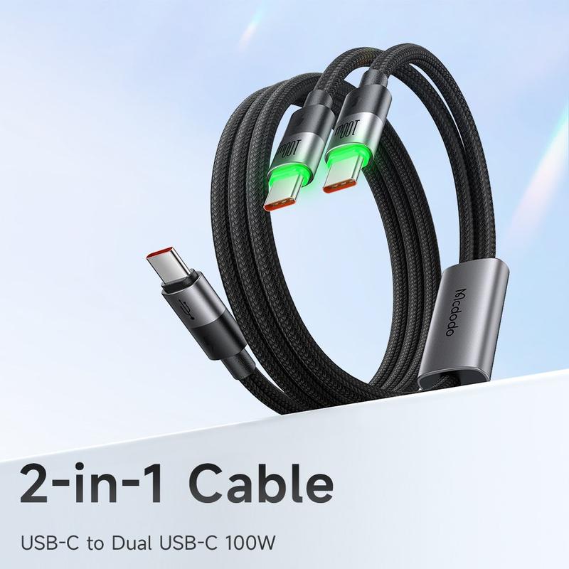 Om skrivbordet, ryggsäcken eller resväskan är full av kablar är den här 2-i-1-flätade kabeln den återställningsknapp du behöver. Två USB-C-kontakter förgrenar sig från en robust jacka, så att du kan snabbladda en bärbar dator eller dela ström mellan två mindre enheter utan att byta adaptrar.