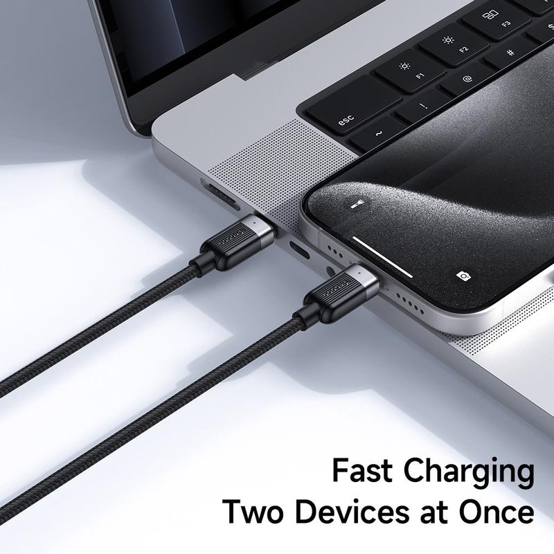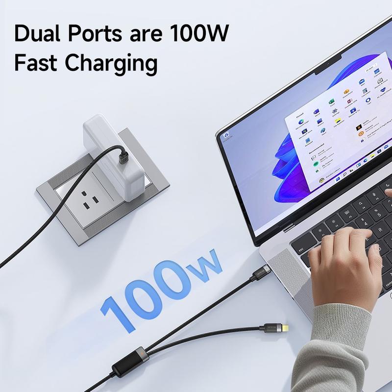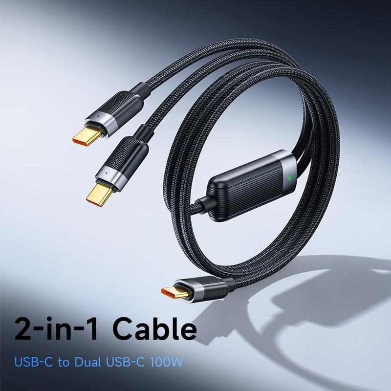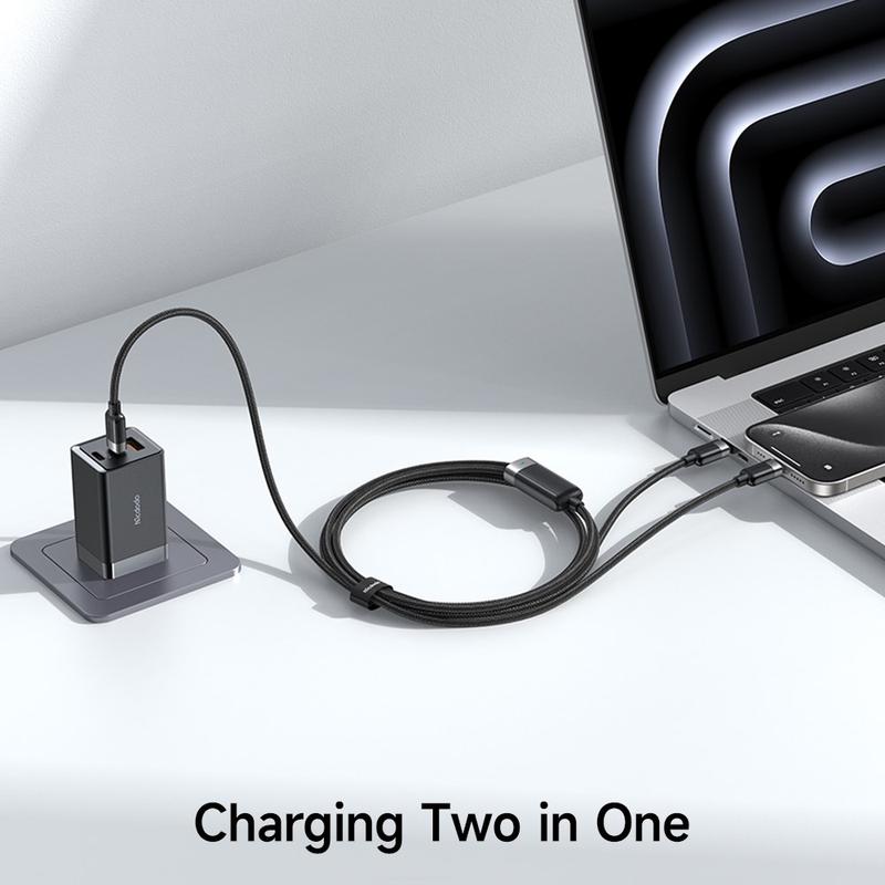 Trött på att jonglera med separata kablar för din bärbara dator och telefon? Den här dubbelhuvade MCDODO-kabeln effektiviserar livet när du är på språng. Två USB-C-kontakter förgrenar sig från en enda, robust flätad jacka, vilket ger dig friheten att snabbladda två enheter eller köra ett kraftpaket med hela 100 W-specifikationen - inga adaptrar, inget krångel.