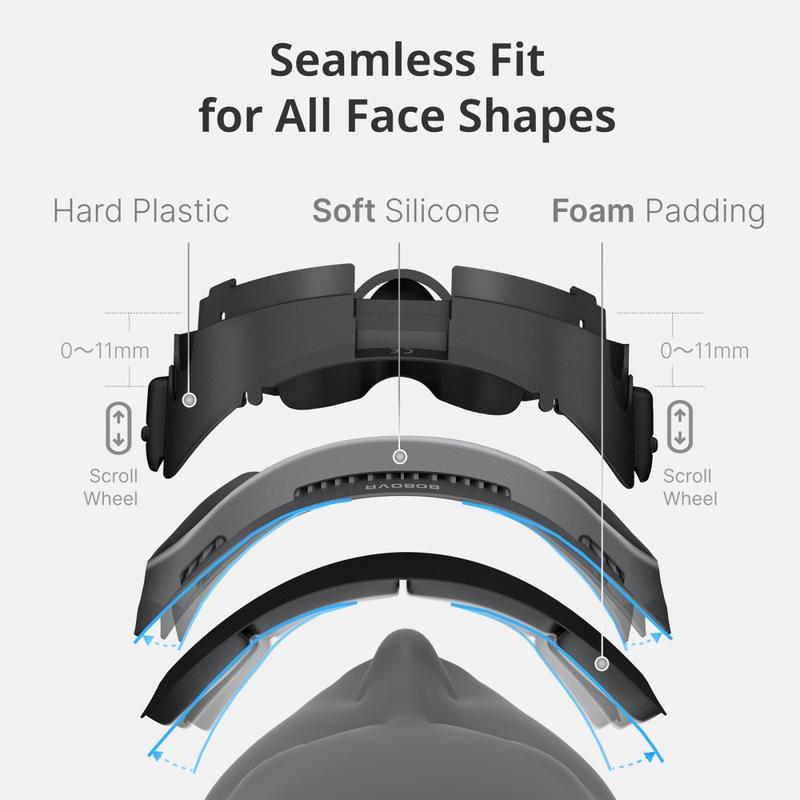 Denna ansiktsmask är kompatibel med alla Meta Quest 3-huvudremmar och anpassar sig sömlöst till ditt headset. Den mjuka silikonpolstringen formar sig naturligt efter olika ansiktsformer och ger en säker men bekväm passform för alla användare.