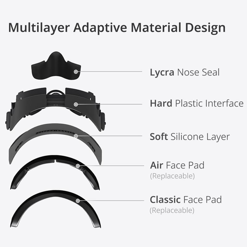 Masken är tillverkad av lycra-tyg som andas och har en ljusblockerande nästätning som minskar oönskat ljusläckage, så att du kan dyka djupare in i dina VR-världar. Den lätta designen gör att du kan fokusera på upplevelsen, inte på utrustningen.