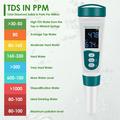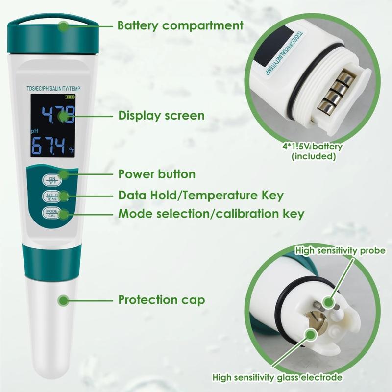 - 4-i-1-mätning - kontrollerar pH 0,00-14,00 (±0,05 pH), TDS 0-9999 ppm (±2 %), EC 0-9999 µS/cm (±2 %) och salthalt 0-10 %.