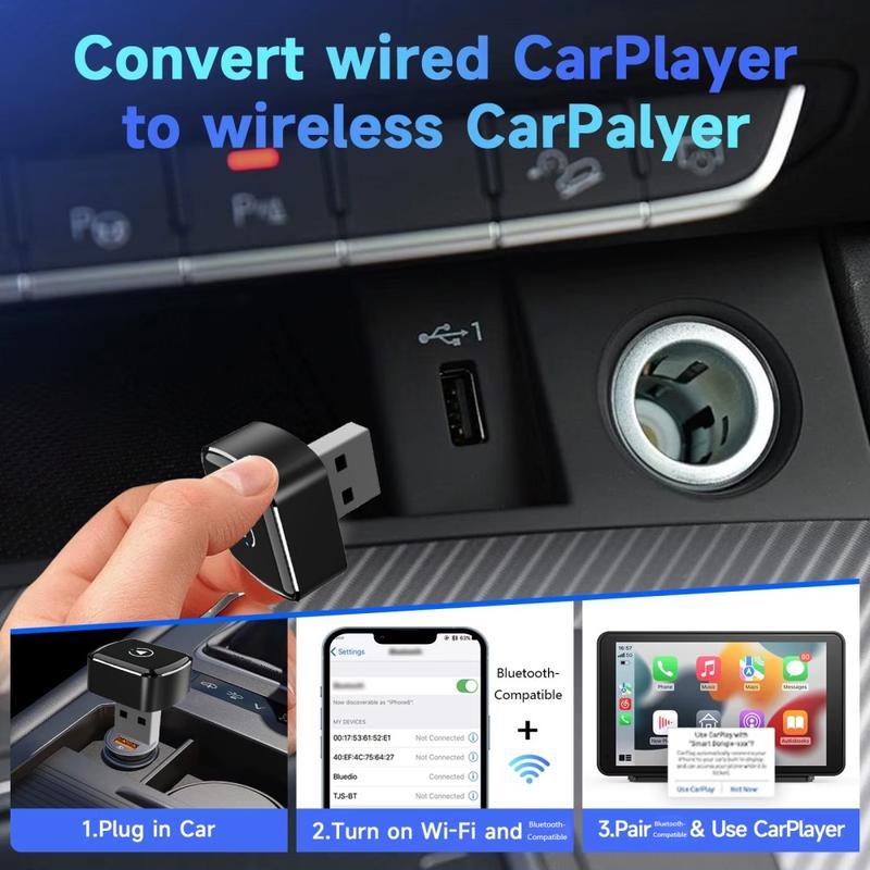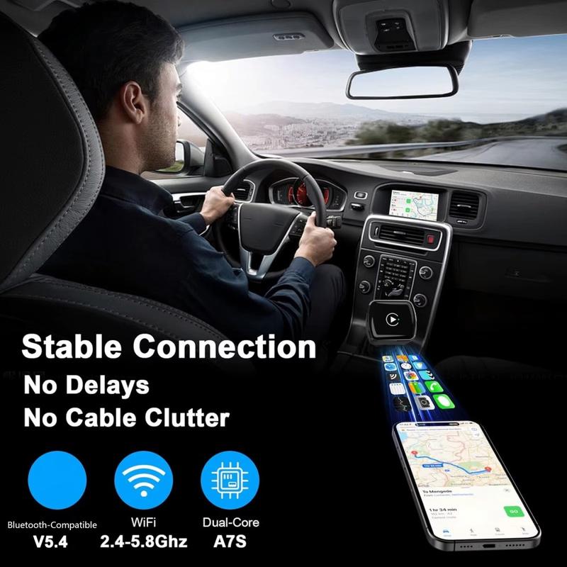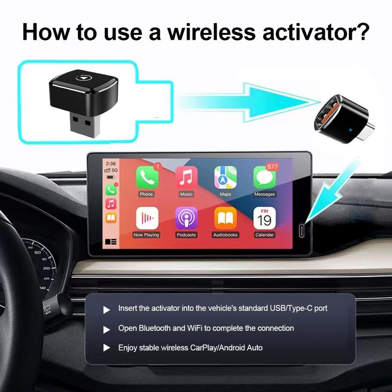 - Funktion: Konverterar trådbunden CarPlay/Android Auto till trådlös