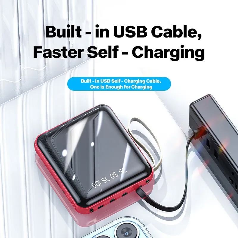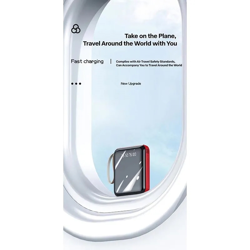 Ladda vilken enhet som helst med denna mini powerbank! Designad med integrerade Lightning-, Type-C- och mikro-USB-kablar och två USB-utgångar - universell kompatibilitet.