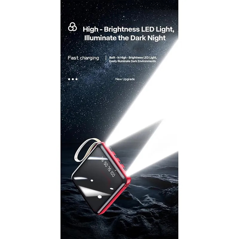 Den här kraftbanken i fickformat har också tre ingångar, microUSB- och USB-C-portar och en inbyggd USB-kabel. Den är perfekt för camping, tack vare kapaciteten 20000mAh och två ficklampor. En spegelliknande yta med digitala LED-nummer för att indikera återstående effekt.