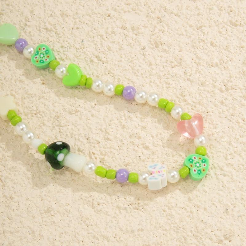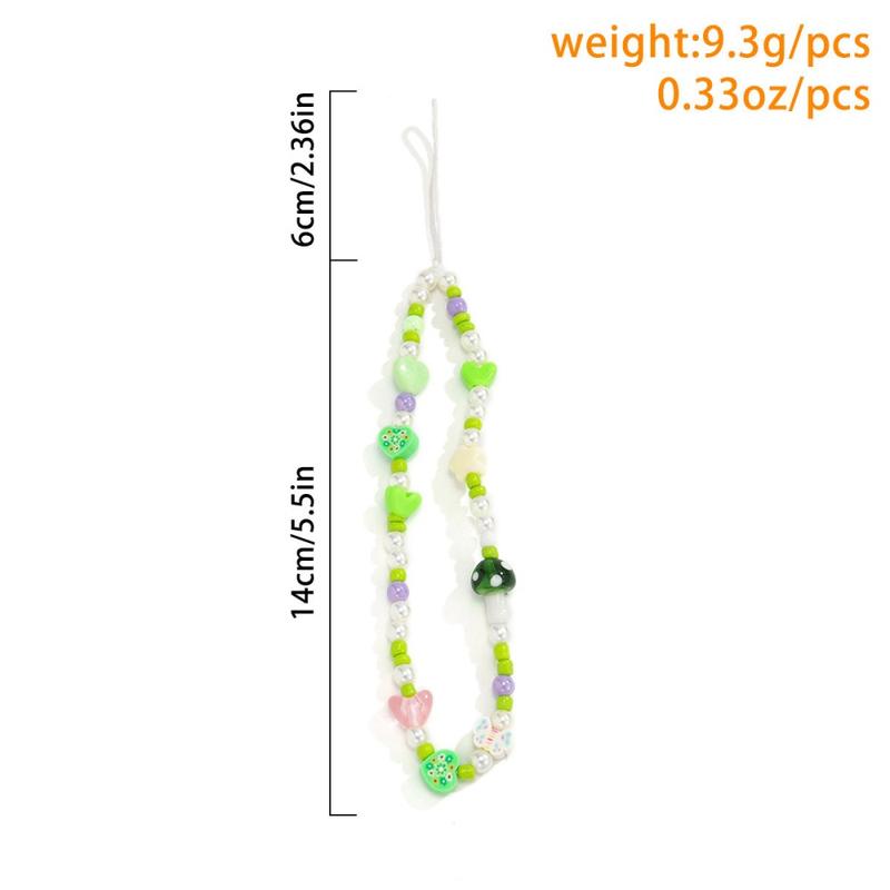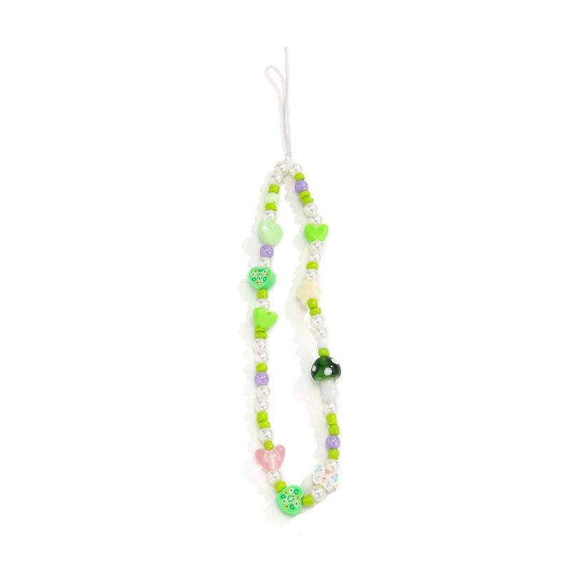Ge din mobil en söt och lekfull touch med detta 20cm långa mobilband med svamp- och pärlpärlor. Det är utformat som både ett dekorativt tillbehör och ett praktiskt handledsband och har en rolig blandning av svampberlocker, imitationspärlor, hjärtan, blommor och stjärnor för en stilfull vardagslook.
