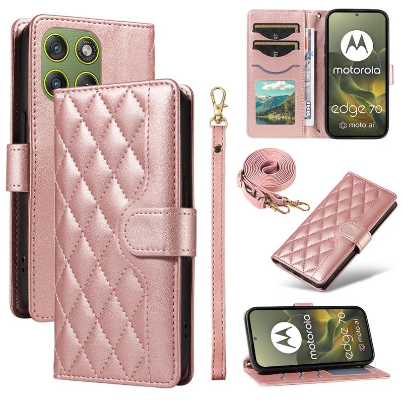Lyxigt quiltat plånboksfodral med axel- och handledsrem för Motorola Edge 70 - skyddande fodral med rombmönster