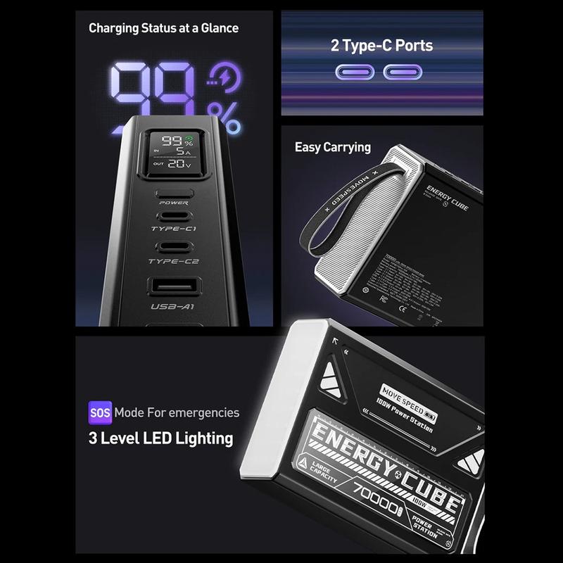 Håll alla dina enheter strömförsörjda i flera dagar med MOVESPEED YSPBZ70Pro-100 Power Bank, som är konstruerad för seriös kapacitet och prestanda. Med ett enormt batteri på 70000 mAh, 100 W PD-snabbladdning och en robust, bärbar design är den perfekt för resor, utomhusarbete och reservkraft i nödsituationer.