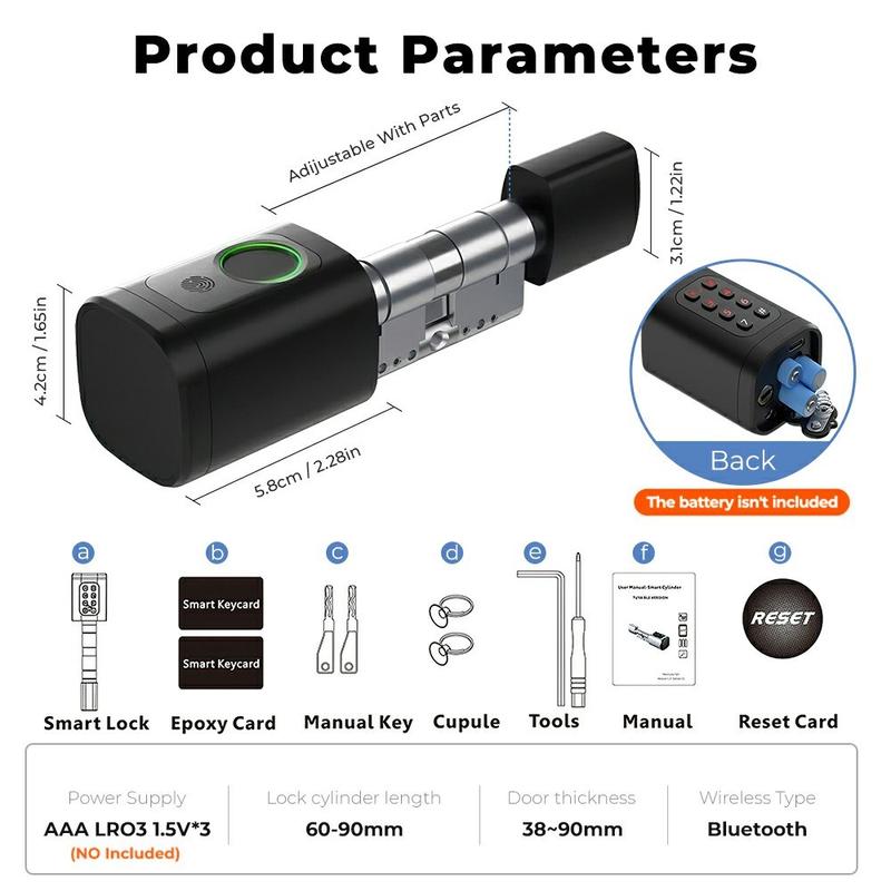 Denna smarta låscylinder är utformad för enkel byte av en befintlig låskärna utan att ändra dörrkonstruktionen. Den justerbara cylindern på 60-90 mm förbättrar kompatibiliteten med olika dörrtjocklekar och vanliga europeiska låsstorlekar. Installationen är enkel och kan slutföras snabbt, vilket gör den till en praktisk uppgradering för användare som vill ha ett smartare låssystem utan mer komplexa dörrändringar.