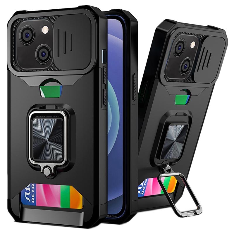 Multifunktionell 4-i-1 Hybrid Skal till iPhone 13 med Korthållare, Magnetisk Ring, Stativ, Kameraskydd