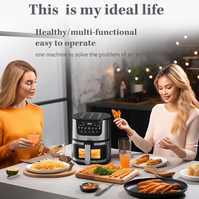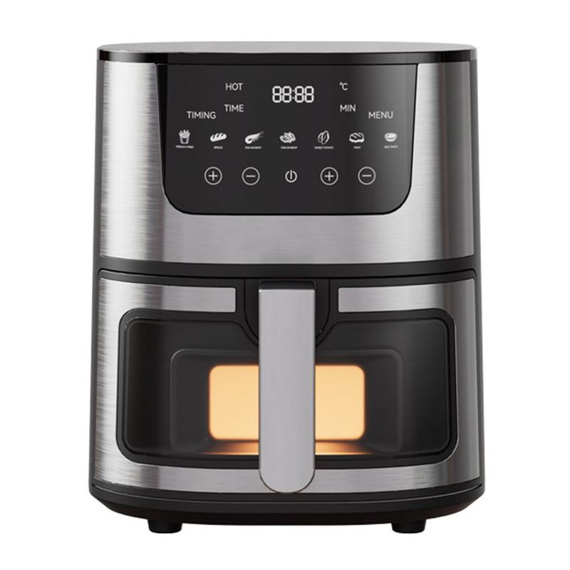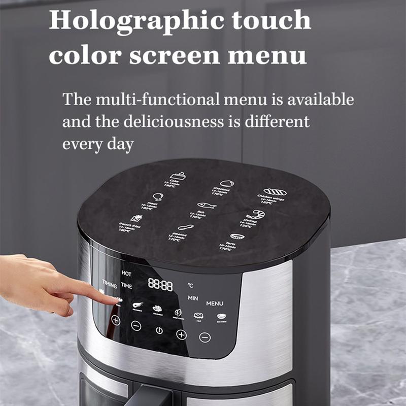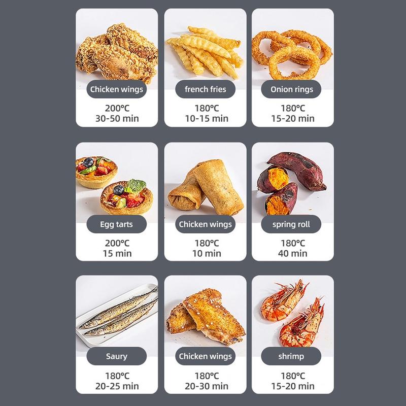 Frityrkokaren är utrustad med ett snabbuppvärmande 1500W-system som ger jämn värmefördelning för genomgående krispiga, möra resultat med lite eller ingen olja. Dess multifunktionella kapacitet gör den perfekt för stekning, bakning, grillning och rostning. Det inbyggda visningsfönstret gör att du kan övervaka tillagningen utan att öppna korgen, vilket bevarar värmen och förbättrar effektiviteten.