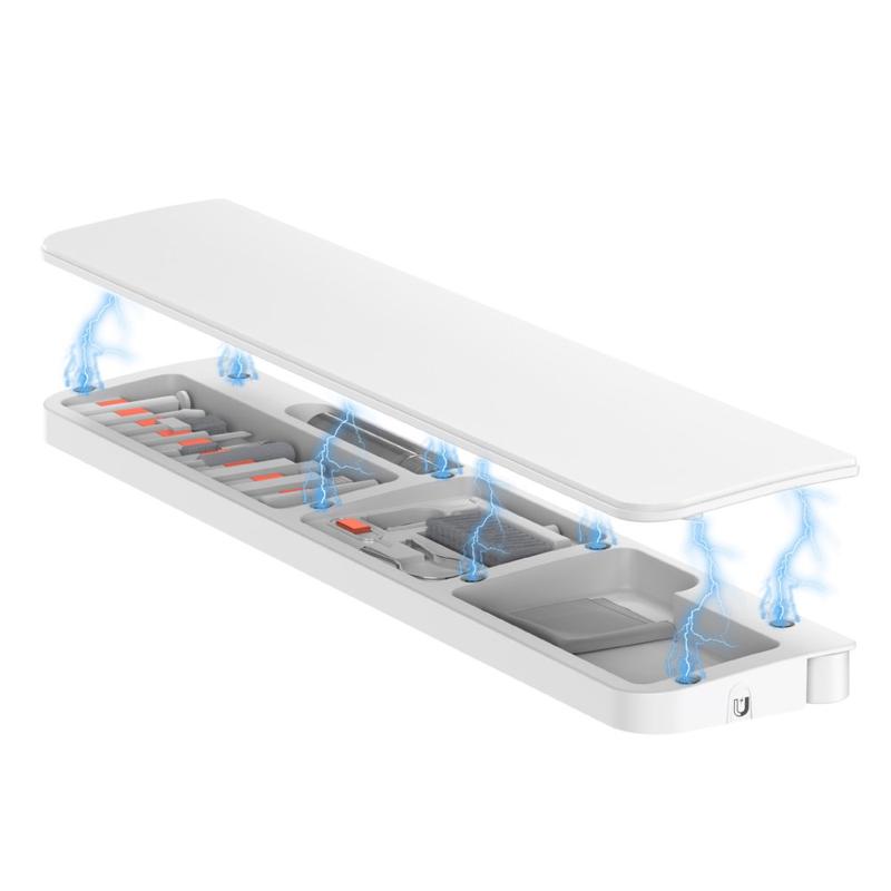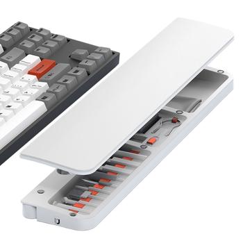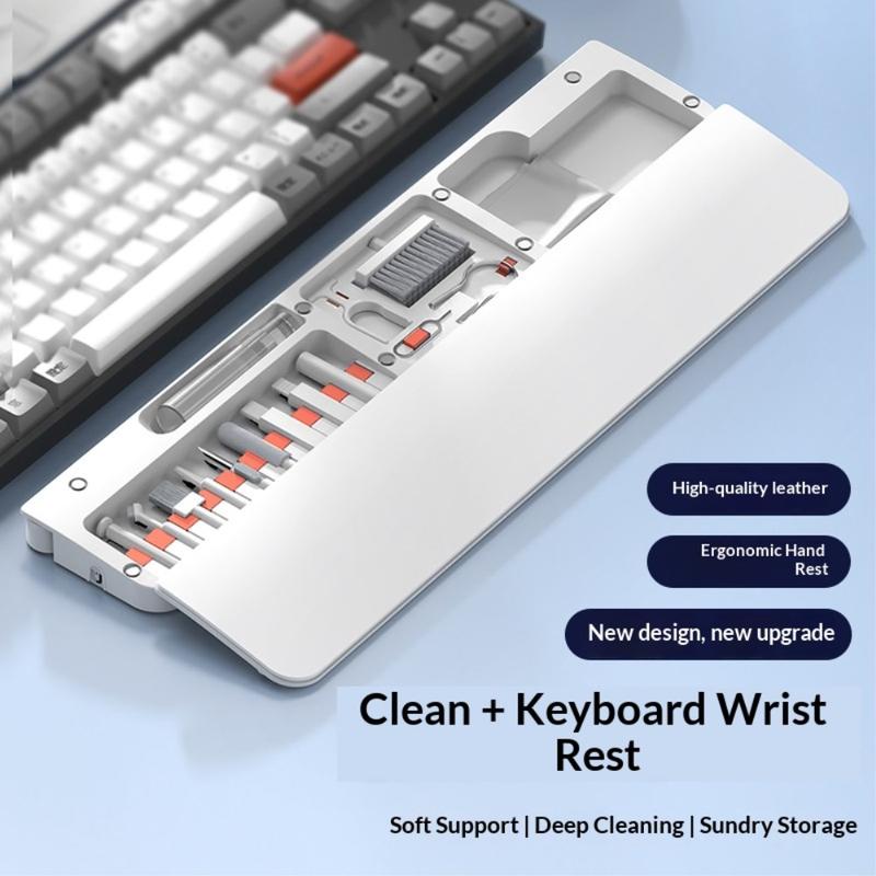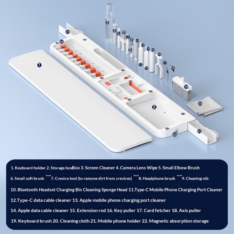 Inuti handledsstödet finns en komplett rengöringssats med 22 verktyg som är utformad för djuprengöring av tangentbord, hörlurar, telefonladdningsportar, kameralinser, strömbrytare och andra elektroniska enheter. Varje verktyg har sin egen plats, vilket gör det enkelt att organisera och snabbt komma åt.