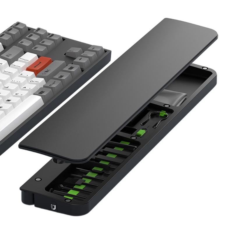 Inuti handledsstödet finns en komplett rengöringssats med 22 verktyg som är utformad för djuprengöring av tangentbord, hörlurar, telefonladdningsportar, kameralinser, strömbrytare och andra elektroniska enheter. Varje verktyg har sin egen plats, vilket gör det enkelt att organisera och snabbt komma åt.