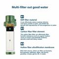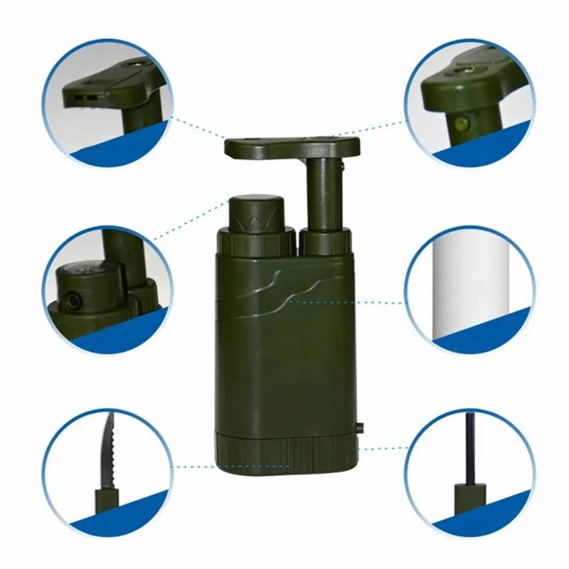 Multifunktionellt vattenfilter/vattenrenare med sugrör och kompass för nödöverlevnad är ett måste för alla som gillar utomhusaktiviteter. Vattenfiltret är tillverkat av livsmedelsklassad ABS-plast och är säkert att använda, kompakt i storlek och lätt att bära, vilket gör det perfekt för utomhusäventyr. Det har ett filtreringssystem med flera lager, inklusive KDF-filtermaterial, kolfiberfilterelement och ultrafiltreringsmembran med ihåliga fibrer, som effektivt filtrerar bort fina partiklar och sediment i vattnet. Den extra kompassfunktionen gör den särskilt lämplig för utomhusbruk. Detta vattenfilter är lämpligt för filtrering av färskvatten från källor som flodvatten, sjövatten, strömvatten, grundvatten, regnvatten och ytvatten, fritt från kemiska föroreningar. Observera att det inte är lämpligt för kraftigt förorenat vatten.