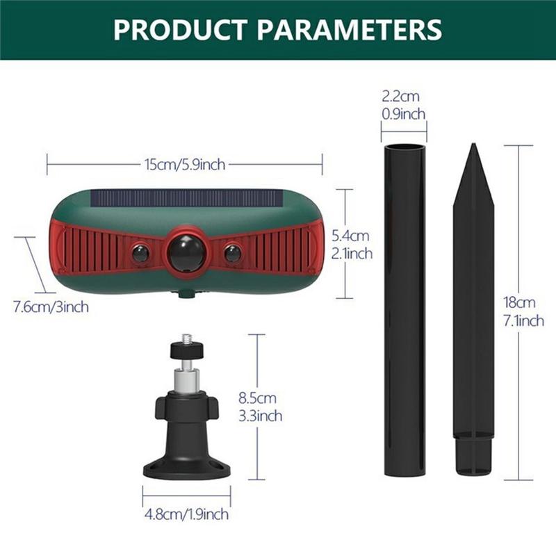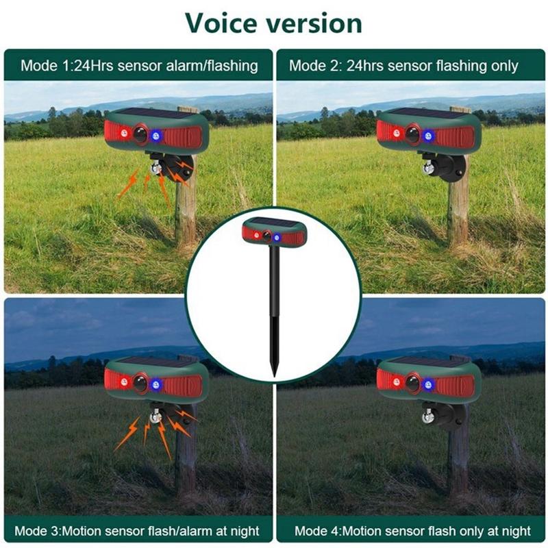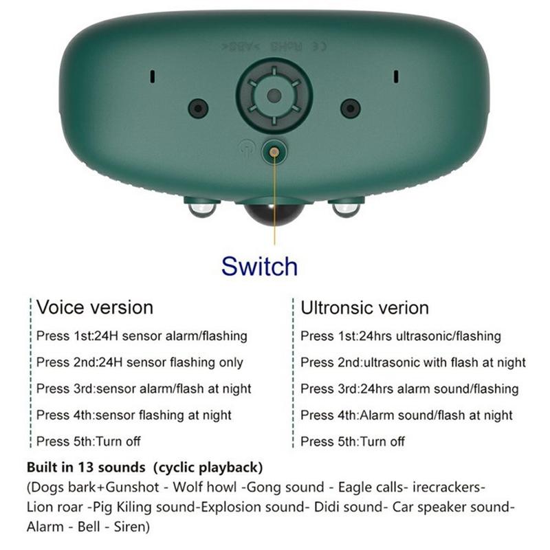 Den här enheten har 12 roterande ljudeffekter, inklusive sirener, hundskall och skottliknande ljud, som erbjuder en mångsidig avskräckande lösning för att hålla djur och skadedjur borta från din egendom.