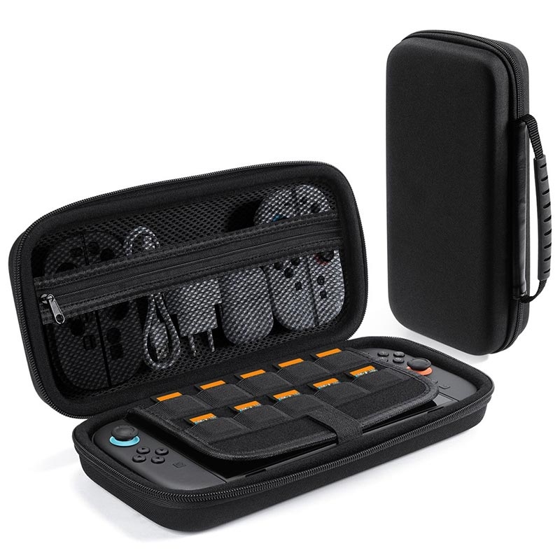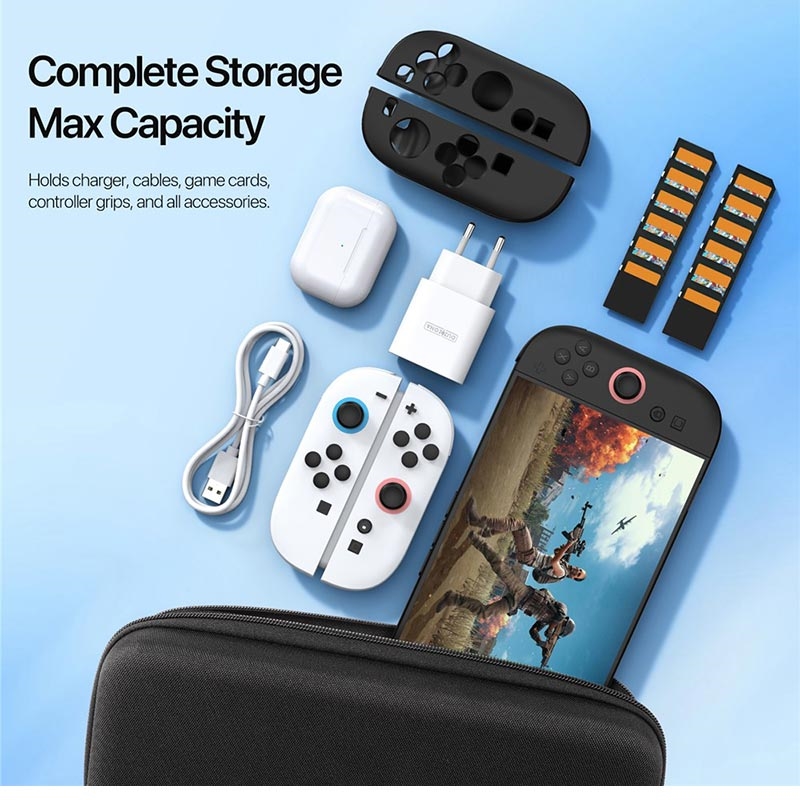 - Gott om invändigt utrymme för laddare, datakablar och Joy-Con-grepp, så att allt hålls prydligt på ett ställe